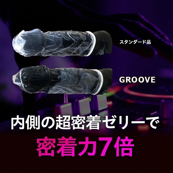 大人気「GROOVE」から待望のLサイズが登場!密着感のヒミツはグルーヴゼリー+ゼリー量600%。(ゼロゼロスリースタンダード品との比較)男性側に高粘度高密着の「グルーヴゼリー」を塗布。超密着によりズレを抑える事で、使用感が減り、生感UP。女性側には高潤滑ゼリーを塗布し、性交痛を軽減するほか、コンドームのごわつき、引っかかりによるゴム感を低減し、生感UP。