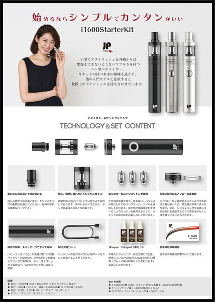 快適なVAPE(ベイプ)ライフをすぐに始められる特製BOX入りのフルセット!電子タバコのペン型ヴェポライザー「JPvapor I-1600 スターターキット シルバー」。小型でスタイリッシュな外観からは想像もできないようなパワフルさを持つペン型ベポライザー。リキッドの持つ本来の風味も逃さず、他の入門モデルと比較すると数段上のポテンシャルを持ち合わせています。