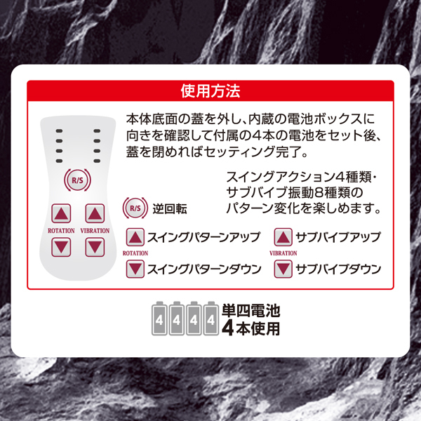 ぐりぐりと抉るような快感!6Vが生み出す強力アクションでGスポを徹底刺激するパール付きの電池式バイブ。4連パールで膣内をゴリゴリと刺激しながら、子機の強力振動で絶頂へ導く!スイングアクション4種類×振動強弱8段階搭載。生活防水製、単四電池をと4本使用、クリアブラック