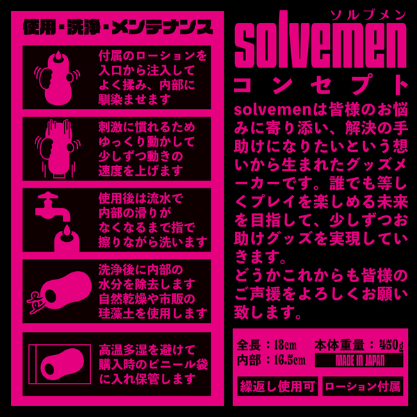 「底を突き破ってしまう…」という長い男性のお悩みに、イボ×ウテルス構造のロングオナホ(ローション付)。悩める男性のためのグッズメーカー「Solvemen(ソルブメン)」から、全長18cmのビッグサイズが登場!重量は肉厚な450g、柔らかな素材ですっぽり包み込み、長さと太さをダブルでカバー♪まったりナマ感が気持ちいいツブ膣壁と最奥にある子宮口へ注ぎ込む感覚をお楽しみください。日本製
