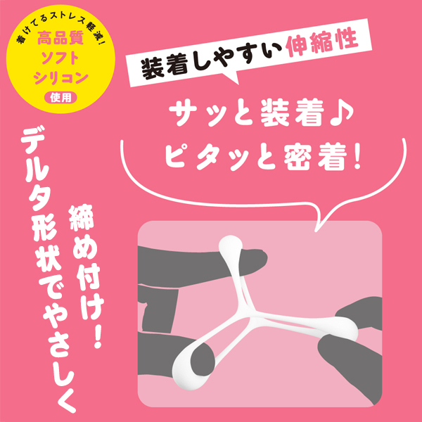 サッと簡単お手軽装着♪デルタ形状で根元を3点締めしてくれる「ぷにっとりんぐ」からデルタ ソフトverが登場しました!ソフトな締め付けで勃起の維持や早イキをしっかり抑制!萎え気味の竿をしっかりと補強してくれます。臭いのない高品質なソフトシリコンの「超!ぷにっとりんぐ デルタ (ソフト)」は内側に滑り止め加工が施されているため、ずれにくくて皮戻り防止にも役立ちます♪伸縮性が良くて装着もラクラク!イキ抑制に優しいリングで夢心地のような射精を促してくれます。マンネリ解消にもおすすめの逸品です!