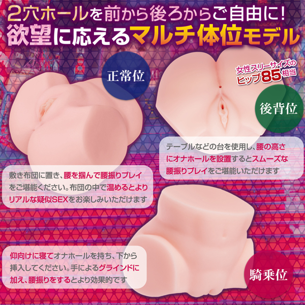 成人女性のまんま実物大サイズの臨場感溢れるリアルなフォルム!世界の名器を完全網羅したシックスプレジャー構造の大型非貫通オナホールです。大きさは「成人女性の実物大サイズ」でスリーサイズの「ヒップ85cm相当」のリアルボリューム。臭い控えめサラサラ触感の「人肌素材」を使用していますので、股間やヒップに顔をうずめる〜などのフェチプレイもお楽しみいただけます。