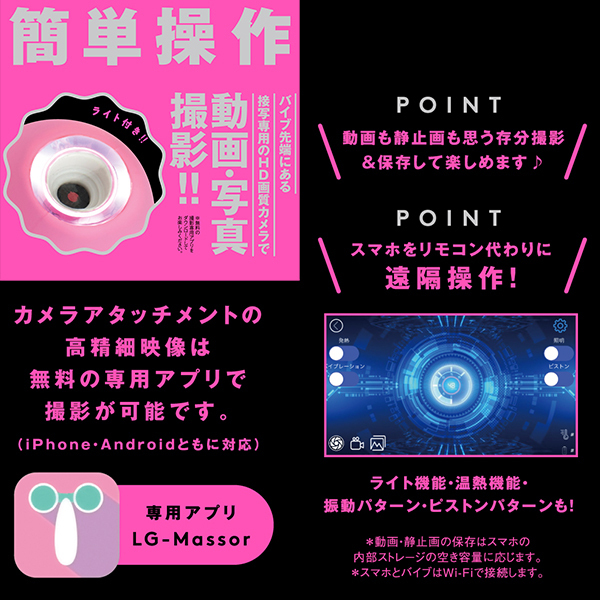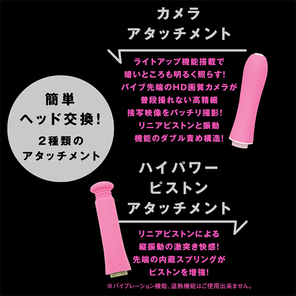 | あの娘のナカや奥まで見えちゃう♪バイブの先端にアソコを接写できるHD画質カメラを搭載した高機能なバイブ「CAMERA PISTON VIBE 90(カメラピストンバイブ90)」です。ライトアップ機能がついたアタッチメントで動画撮影や写真撮影も楽しめる!パートナーのあそこのナカを見たい欲求を満たしてくれるとともに、温感を楽しめるバイブとしても優秀なのでハイパワーピストンとリニア式のピストンアクションで極上の快感を体験できます♪お好みのリズムで感じられる9パターンのバイブ振動にリニア振動による重厚な奥突きピストン10パターン!高品質シリコン仕様でやさしい肌触りを確かめながら、温熱機能搭載で人肌感覚のぬくもりもお楽しみ頂けます。2種類のアタッチメントで簡単ヘッド交換、飽きのない充実機能!本体は充電式で充電時間約210分。最大連続稼働時間約70分(初期振動パターン未変更時)です。生活防水機能付き。付属品はアタッチメント、USBプラグ式充電コード。※カメラ機能は無料の撮影専用アプリをダウンロードしてお楽しみください。 |