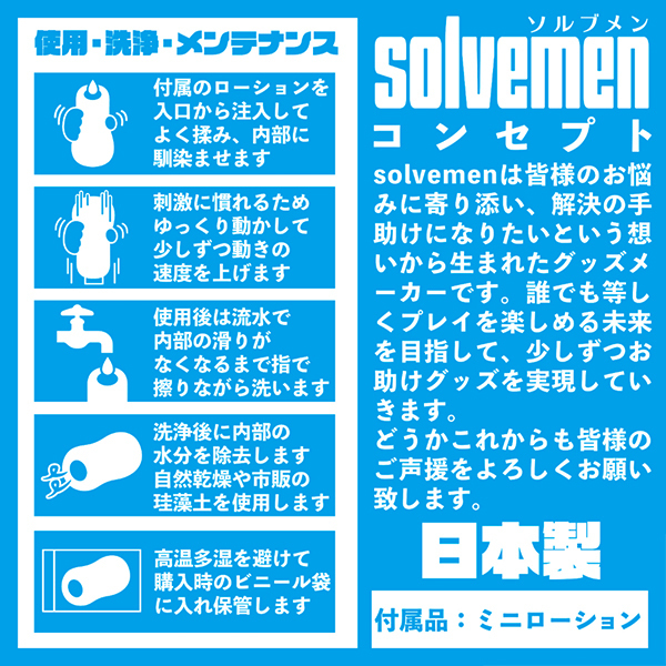 開放感がありマッタリとしたロングな快感が味わえる非貫通型オナホ「とにかくひろい」。普段からゆったりとした余裕のある内部構造を待ち望んでいた方にとっての嬉しい仕様♪柔らかめの素材で無理なく長時間楽しめるように工夫されていて、ねじれヒダと内部の広さ、焦らしが織りなすソルブメンのコンセプト型ホールなら毎日楽しみながら新しい扉を開く事ができる事でしょう。素材は安心安全の日本製!繰り返し何度でもご使用頂けます♪