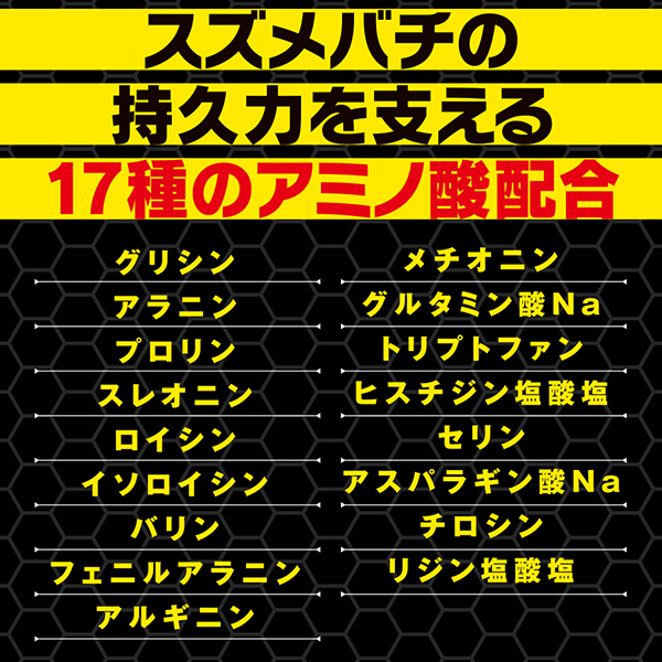<成分>グリシン、アラニン、プロリン、リジン塩酸塩、スレオニン、ロイシン、イソロイシン、バリン、フェニルアラニン、アルギニン、メチオニン、グルタミン酸Na、トリプトファン、ヒスチジン塩酸塩、セリン、アスパラギン酸Na、チロシン