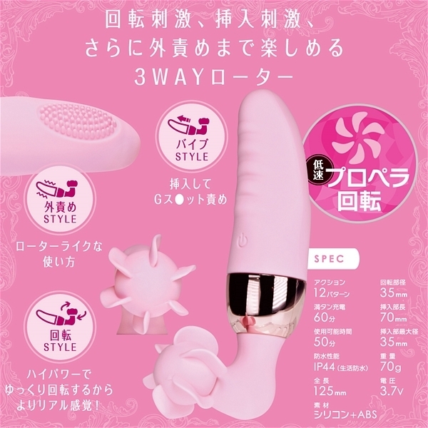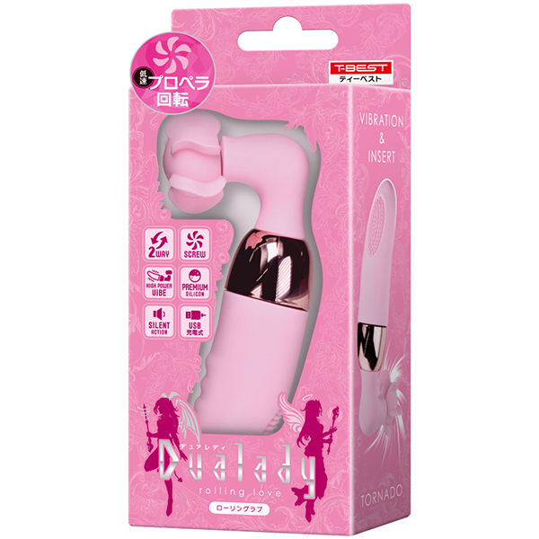 低速プロペラ回転&絶妙振動の2つのギミックが個別に楽しめるデュアレディ最新作。心地良い低速での回転がリアルな舌の感覚を再現したヘッドの反対側にはハイパワーの高性能モーター振動で外責め・挿入のどちらも楽しめる形状のバイブレーターヘッド。2つの形状で3種類の楽しみ方が出来ます。素材は肌触りの良い滑らかな高品質シリコン採用。プレイの邪魔をしない静音設計。回転・振動・挿入が楽しめる3WAYローター。60分充電で最大50分使用可能なリチウムイオンバッテリー内蔵(使用環境によって大幅に増減する可能性が御座います)。