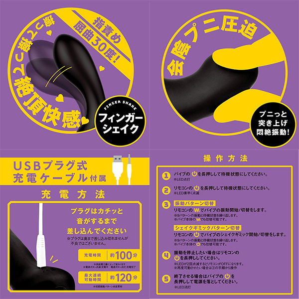 オトコのホットスポットを指のような動きで擦り責め!PPPより指を振るようなシェイクギミックを搭載したアナニーバイブが登場!30度の角度で屈曲するフィンガーシェイクギミックが、敏感部分を擦って擦って絶頂快感♪2箇所に配置された超強力Wモーターが超密着振動&会陰悶絶振動で激しく責め立てる!ギミックパターン9種類×振動パターン9種類の計81パターンがあなた好みの刺激で楽しめます♪柔らかシリコンがプニっと突き上げ圧迫するのがとっても気持ち良い会陰プニ圧迫構造。肌ざわり滑らかな高品質ソフトシリコンでツルンと簡単挿入フォルム。ナマ指に責められているような快感にアヘアへ昇天っ★女の子みたいにイケるメス堕ちイキ仕様の優秀バイブ!いろんな遊び方を模索して、もっと新しい快感を見つけてくださいね!本体は充電式なのでエコに使用可能。充電時間約100分、最大連続稼働時間約120分(初期振動パターン未変更時)・IPX7等級・パターン振動