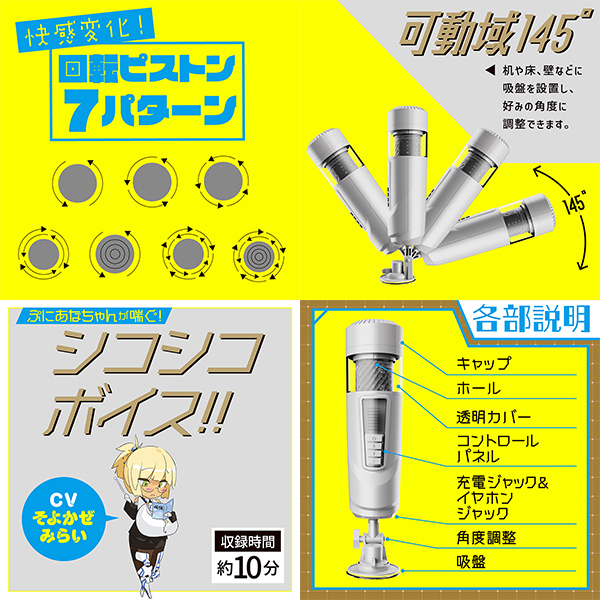 SEXよりすごい!超絶スクリューの電動オナホ!ぎゅるぎゅるじゅぽじゅぽー!回転しながらパワフルピストンで超強引に抜きにくる淫乱SEXマシーン!快感変化の回転ピストン7パターン!ホールは直接肌に触れるものだから、安全性と感触にこだわった高品質なエラストマーを使用しています。耐久性抜群のもっちりぷにぷに弾力素材を使用しています。360°の巨大イボ突起が色々な動きに順応し、常時、高密度な絡み付きを実現!ぷにっと柔らかな臨場感倍増のリアルな挿入口もオススメです。初心者にも優しく使いやすい電動ホールです。シンプルボタンでラクラク操作!ホールを取って洗うだけ、後処理簡単!ちょうどいいサイズ感で、手持ち操作も可能!ぷにあなちゃんが喘ぐシコシコボイス収録(CV:そよかぜみらい)!パッケージイラスト:maruku