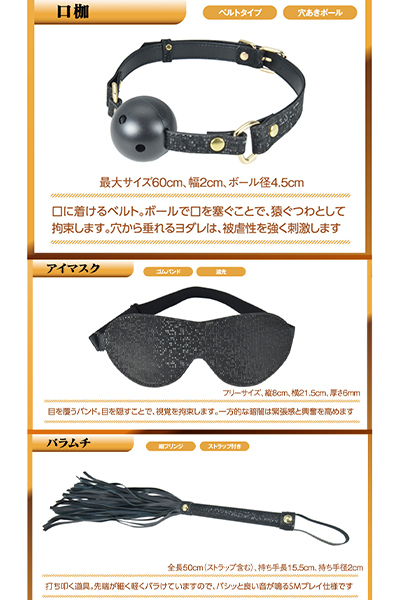 パッケージ:17.0×23.0×6.5cm 本体:アイマスク(縦8cm・横21.5cm・厚さ0.6cm)、口枷(最大サイズ60cm、幅2cm、ボール径4.5cm)、手枷(最大サイズ27cm、幅5cm、チェーン長10cm)、足枷(最大サイズ31.5cm、幅5cm、チェーン長10cm)、バラムチ(全長50cm、持ち手長さ15.5cm、持ち手径2cm)