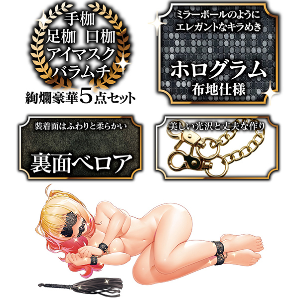 好きなあの子をキラめかせる……。まるでスパンコールのようにキラキラ輝く、絢爛豪華な5点セット「SM5プレミアム」!SMアイテムだって、大切なファッションアクセサリー。他ではお目にかかれない特殊な専用布地を用いたSMアイテムはいかがですか?一見するとマットなブラックカラーですが、光を当てるとキラキラと反射、まるでミラーボールを纏ったようにシャイニーなブラックへとキラめきます!SMセットの内容は、視覚を奪う「アイマスク」、言葉を封じる「口枷」。両手を束縛する「手枷」、移動を束縛する「足枷」、そしてSMの代名詞「バラムチ」と、初めてでも大満足なセレクション。さらに、装着アイテムのインナーには、お肌に優しい柔らかベロア生地を使用しました。金属部は高品質でゴージャスなゴールドカラー。好きなあの子をもっと輝かせ、非日常なラグジュアリーを彩る、ドレッシーなSMコーディネイトアイテムです。