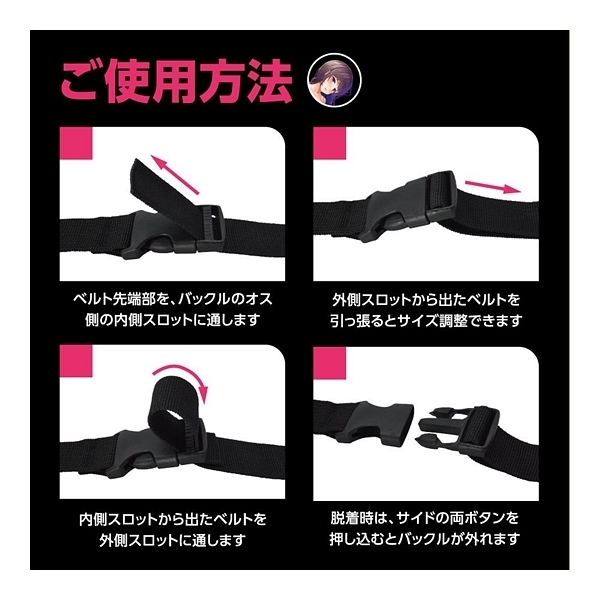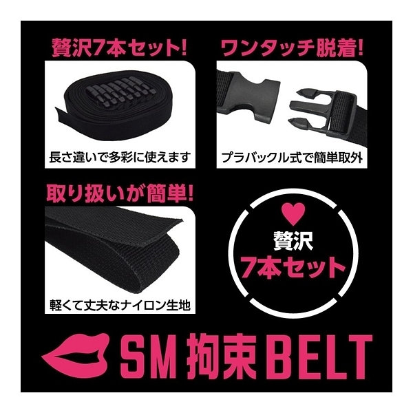 好きなあの子をいいなりに……。これひとつでSMプレイの拘束を簡単にする、ボンデージ用ベルト7本セット「SM拘束BELT」!SMプレイの核心となる「拘束」を、とってもお手軽にするSMアイテムです。ワンタッチで装脱着できる、バックル式のナイロンベルトです。クルッと巻いてカチッと装着、アジャスターからベルトを引っ張ってサイズ調整すれば、しっかり適切の拘束緊縛。ベルトはナイロン素材で強度もばっちりの頑丈仕様。バックルはサイドリリースバックルの差し込むだけで装着&サイドボタン押すだけで脱着の簡単仕様。アジャスターでサイズ調整できますので場所を問わずにぴったりフィットします。長さ違いの7本セットですので、様々な場所を拘束出来ます。手枷、足枷、頭枷、胴枷、太腿枷、と多彩な拘束バリエーションとなります。さらに、家具に縛り付けたり、おもちゃを固定したりなどの使い方もOK!クルッ&カチッと巻くだけで簡単に拘束プレイを楽しめます!●カラー:ブラック