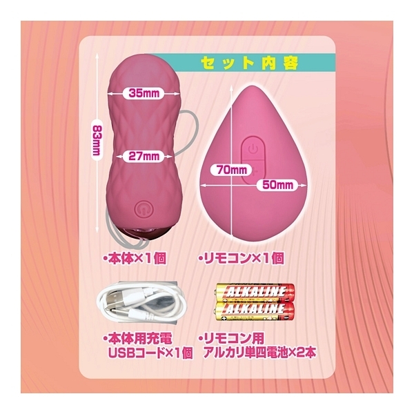 パッケージ:17.8×10.7×4.0cm 本体:8.3×3.5cm 重量:68g 電池:ローター(USB充電式)、リモコン(単四電池×2本使用)