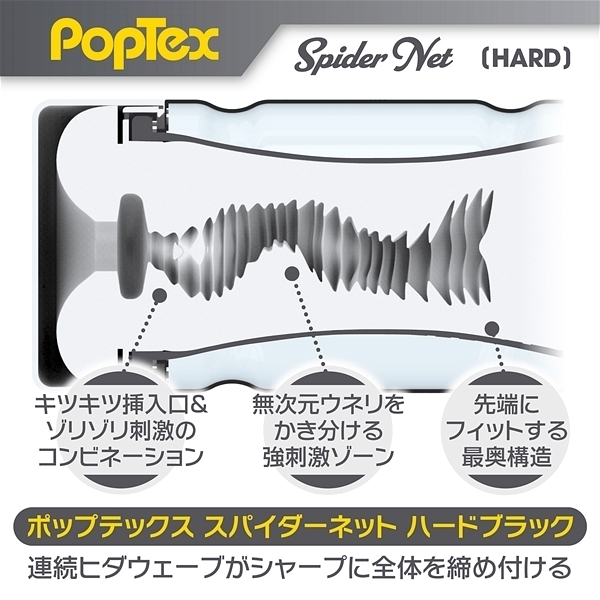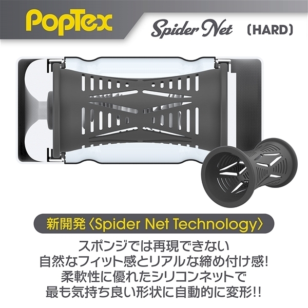ポップテックススパイダーネットカップハード<リアルな締め付け×ネットヒダ刺激の高機能カップホール>新開発SpiderNetTechnology搭載型カップホール!ホールを包み込む柔軟性に優れたシリコンネットで最も気持ち良い形状に自動的に変形することでスポンジでは再現できない自然なフィット感とリアルな締め付け感を実現しました!内部構造は網目状のネットヒダの中心にアクセントのイボ刺激のアクセント!強力に吸い付く最奥のバキュームスポットは天面の「OneWay」シールを剥がし空気を抜いて挿入することで内部のまとわりつき感をより楽しむことが出来ます。ハードタイプのネットと肉厚のホールはギュギュッと高刺激な締め付け感で圧倒的な快感をあなたにお届けします。使い捨てカップは経済的にも衛生的にもちょっと不安!という方にもおすすめの、本体をはずして洗える「リユースカップ」仕様。ニオイ・ベタつきをカットした使い心地の良いもちもち素材を使用。YELOLABローション付属。