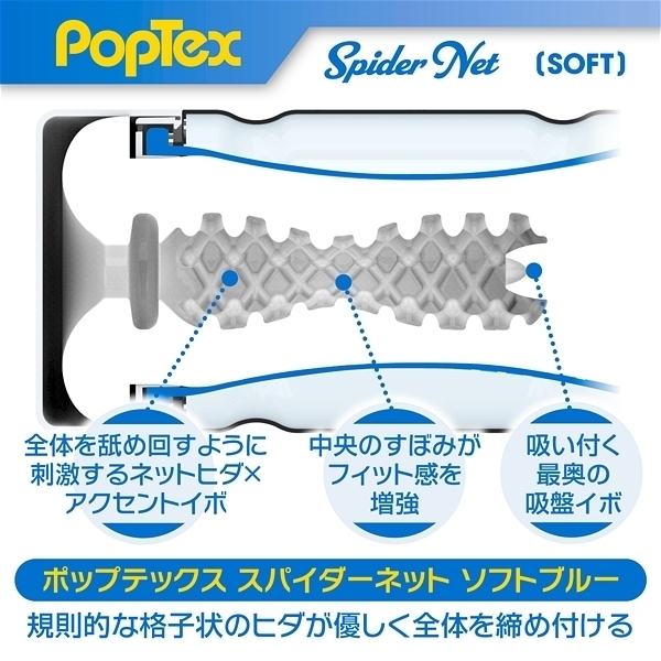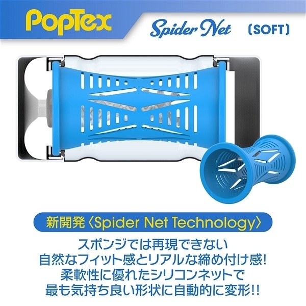ポップテックススパイダーネットカップソフト<リアルな締め付け×ネットヒダ刺激の高機能カップホール>新開発SpiderNetTechnology搭載型カップホール!ホールを包み込む柔軟性に優れたシリコンネットで最も気持ち良い形状に自動的に変形することでスポンジでは再現できない自然なフィット感とリアルな締め付け感を実現しました!内部構造は網目状のネットヒダの中心にアクセントのイボ刺激のアクセント!強力に吸い付く最奥のバキュームスポットは天面の「OneWay」シールを剥がし空気を抜いて挿入することで内部のまとわりつき感をより楽しむことが出来ます。ソフトタイプのネットと肉厚のホールは優しくあなたを包み込むことで緩やかな快感をお届けします。使い捨てカップは経済的にも衛生的にもちょっと不安!という方にもおすすめの、本体をはずして洗える「リユースカップ」仕様。ニオイ・ベタつきをカットした使い心地の良いもちもち素材を使用。YELOLABローション付属。
