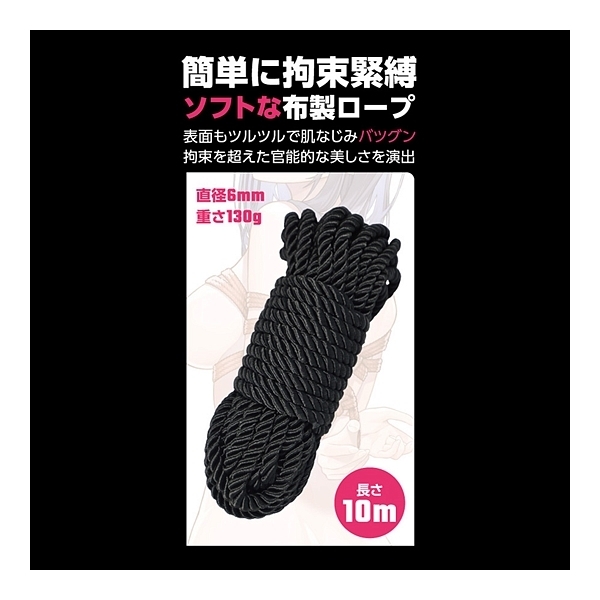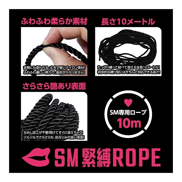 好きなあの子をいいなりに…。SMプレイの憧れとも言える縄緊縛が楽しめる、SM専用ロープ「SM緊縛ROPE」!SMプレイの華、「緊縛」を気軽に始められるSMアイテムです。柔らかいナイロン素材を使ったロープですので、初心者の方でもOK!柔らかさが弾力となり痛みになりづらく、表面もツルツルで肌なじみバツグン。速乾性もあるので洗いやすくお手入れも簡単。麻縄とは異なり、毛羽処理やなめし加工など必要なく、開封後すぐに緊縛できちゃいます!長さは贅沢に使える全長10メートル。太さは取り回しやすい直径6ミリ。表面には高級感のあるしっとりとした光沢仕様。手首などの基本的な縛りはもちろん、椅子や家具などに縛り付けて固定緊縛も。さらには後手縛り、手上げ縛り、胡座縛り、屈脚固定縛りなどの本格的緊縛術にもチャレンジ!綺麗な柔肌に縄が食い込む様子は、単なる拘束を超えた官能的な美しさを演出します。●カラー:ブラック