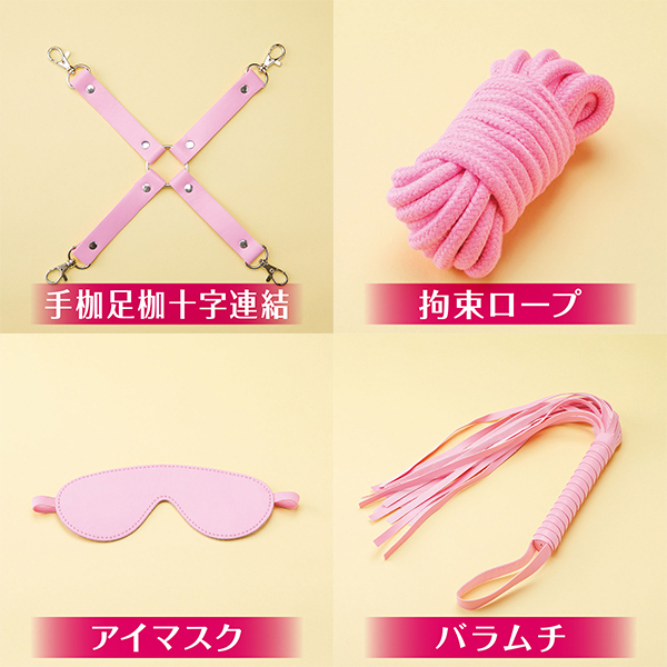 パッケージ:17.0×22.0×8.0cm セット内容:アイマスク、ボールギャグ、リード付き首輪、乳首枷、手枷、足枷、手枷足枷十字連結、バラムチ、フェザー、ロープ