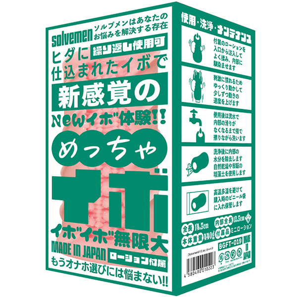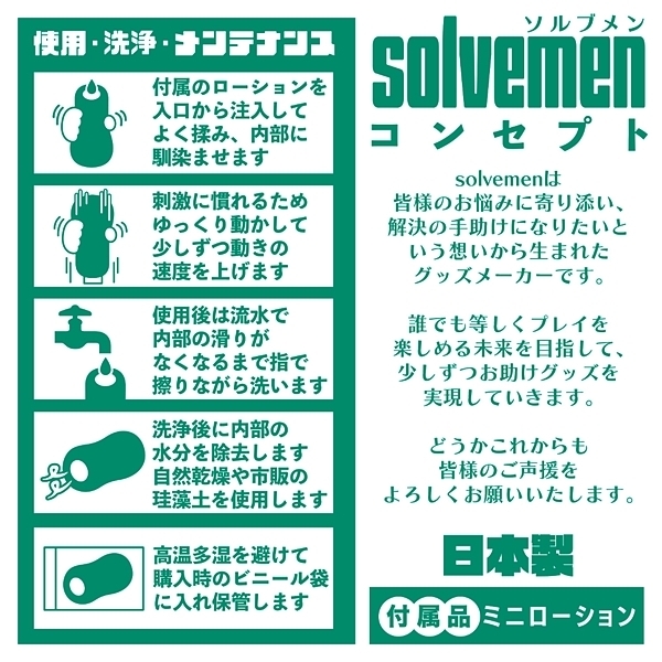 ソルブメンはあなたのお悩みを解決する存在です。「今日はイボで刺激的に」「今日はヒダでやさしく」同じものを使い続けたいときもあれば、1日おきに違うものを使いたいときもある。そんな気まぐれに全力で応えたいです。それがソルブメンの生まれた意味だと思いませんか?今回のテーマは「めっちゃイボ」となります。敢えてイボだけにしなかった意図をお教えしましょう。ヒダのなかに確かな存在感、イボは本当にイボ。それは間違いないのです。しかし敢えてヒダの群れにイボを配置する事でしか生まれない、極上の快感ハーモニーがあることをどうしても感じて欲しかったのです。あなたはオナホ選びに悩む必要はなくなります。あなたのためにソルブメンがいるのです。安心安全の日本製で繰り返し何度でも利用が可能です。