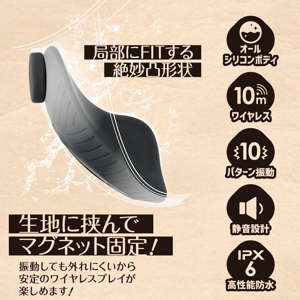 マグネットで挟んでピッタリFITする静音ワイヤレスローター。ズレにくくピンポイントで好きな所でローターを固定出来るのでより集中してプレイを楽しめます。肌触りが滑らかな高品質シリコン素材採用。ワイヤレス稼働距離10M、120分の充電で最大50分使用可能、ローター部分はIPX6の高レベル防水なのでしっかり洗えて衛生的にも安心してお使い頂けます。※使用環境により電池の減りは大幅に増減します●ブラック
