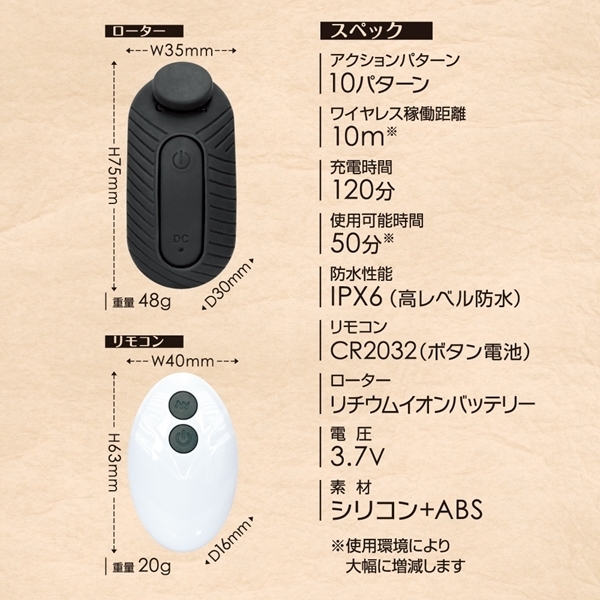 パッケージ:10.0×10.0×3.5cm 本体:ローター7.5×3.5×3.0cm、リモコン6.3×4.0×1.6cm 重量:68g USB充電式