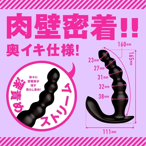 肉壁密着!!未開発ゾーンの奥イキ!最深で160mmまで挿入できる深責めストリームは肉壁への密着度が徐々に増す焦らし責めの奥イキ仕様!ぷにぷにした5連ビーズで柔らかくて安心の挿入感♪超強力W振動モーターが芯から震える重厚な振動!突き上げるような悶絶感を味わえる会陰振動!自分好みの刺激をリモコン操作で簡単に堪能できます。ツルンと簡単に挿入できるフォルム&高品質シリコンを使用しておりますので、肌ざわりがとっても滑らかです。女の子みたいにイケるメスイキ仕様の優秀バイブ!いろんな遊び方を模索して、もっと新しい快感を見つけてくださいね!※本体:充電時間約170分(供給電力量によって変わります)※本体:最大連続稼働時間約170分(初期ギミック・振動パターン未変更時)_IPX6等級_振動パターン:10種類_40dBの静音設計_付属品:電池式リモコン_USBマグネット式充電コード※IPX6:放水ノズルを使って噴流水を最低3分間あてる試験(浸水は不可となります)