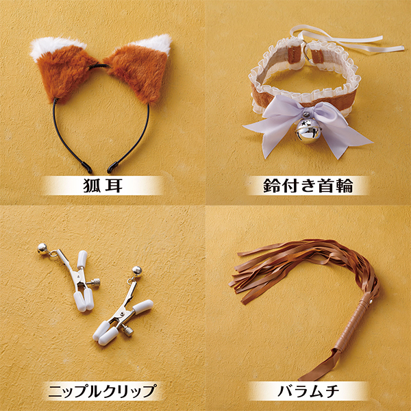 可愛らしい狐娘に変身できるソフトSM5点セットです♪セット内容は、キュートな狐耳カチューシャ、鈴付き首輪、乳首クリップ、しっぽ型アナルプラグ、そしてバラムチが含まれています!初心者にも扱いやすい優しい素材で作られており、安心してプレイを楽しめます♪可愛らしさとソフトな刺激を両立し、パートナーとの特別な時間を盛り上げるのにぴったりです!しっぽやバラムチはリアルな質感で、見た目の可愛さだけでなく使用感にもこだわっています♪乳首クリップは鈴付きで遊び心もプラス!首輪も軽くて装着しやすく、コスプレ気分を手軽に楽しめます♪コンパクトで使いやすいセット内容なので、初心者から経験者まで幅広くおすすめです!日常に新しい刺激をプラスしたい方にぜひお試しいただきたいアイテムです♪