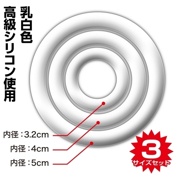 デキる男の変身アイテム!高級シリコン製コックリング3サイズセット「パワーリングDX」。●サイズの異なるリング×3個セット●内径:5cm(大)・4cm(中)・3.2cm(小)●乳白色の高品質シリコン素材を使用●伸縮自在で肌触りも良く装着感抜群。お肌に優しい自然な感触!サイズやお好みに応じて3サイズを使い分けられる高品質シリコン製のペニスリング3個セット。カリ首や根元などお好きな部位に装着することで、様々な刺激を楽しめる男性用補助グッズです。