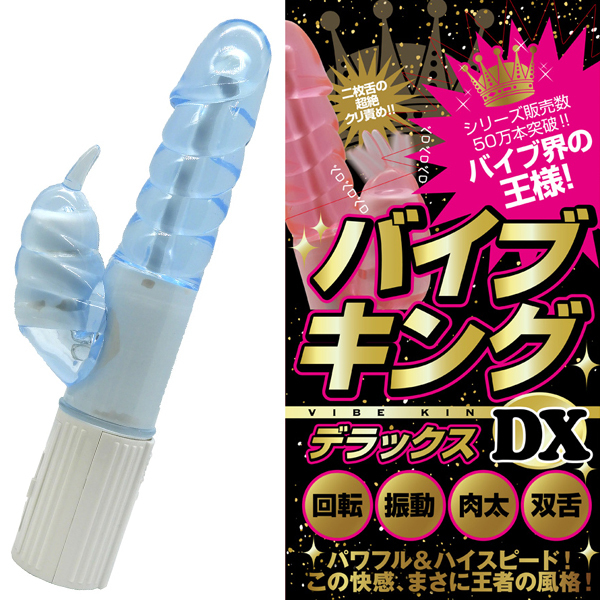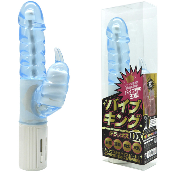 透き通るようなクリアブルーが美しい電池式バイブ。累計販売50万本の大人気作「バイブキング」が更に進化して登場!従来通りの気持ちよさに加えて、むっちり弾力の肉太三段ボディと2本の触手付き子機から繰り出す強力振動&パワフルスイングで強烈な快感をもたらします。心地よい肉感を感じながらキングを超えるデラックス級の刺激を是非ご堪能ください。単三電池を3本使用