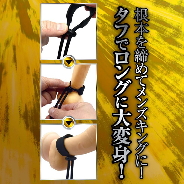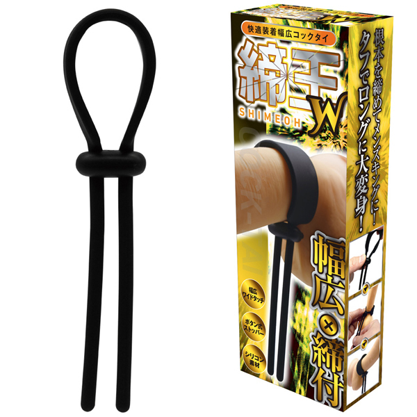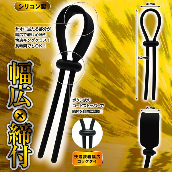 根本を締めてメンズキングに!快感キングクラスのコックタイ、「締王」!根本に巻きつけて、ネクタイのようキュッと締めれば、まるで王者のような貫禄に大変身!締め付け部分のコードストッパーは、自由に調整できるボタン式!本体素材は、肌触りがよいシリコン製!締め付ければ、もう貴男はまさにメンズキング!タイプ「W」は、「WIDE」の「W」!サオに当たる部分が幅広仕様で、快適な着け心地のコックタイです。接地面がワイドとなるので、長時間着けても痛くなりにくい!快適な装着感で、タフでロングに大変身!