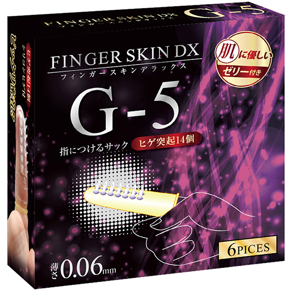 7つのトゲトゲ状の山型突起を搭載したラブグッズ版の指サック「フィンガースキンDX (G−5)」です。サックの薄さは0.06mmとコンドームのような薄さを実現!挿入時には体温が感じられるほどの薄さで、表面にはゼリーが塗布されていて挿入しやすく衛生的♪合計14個の突起はシリコン製で繊細な指の動きにもしっかり対応。圧力によってはさわさわとした感じやチクチク、ツンツンといった刺激になるのでいつもの指技にユニークな刺激をプラスできます♪