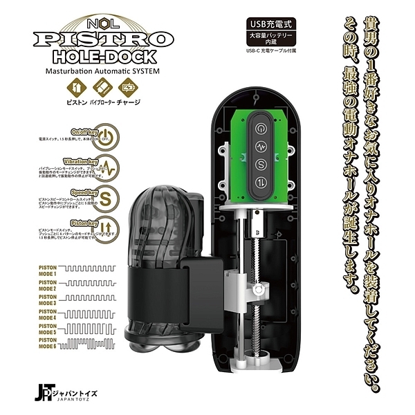 アナタのお気に入りのオナホールを合体させたら、理想の電動ピストンホールに早変わり!ハイパワーモーターと大容量バッテリー搭載。付属の専用ローターを専用ホールのローターポケットに装着して使用すればピストンだけじゃなく、バイブ振動も楽しめる。6種類のピストンモード×5段階のスピード変更×10種類のローター振動で、約300通りの中から最適なパターンが選択可能。充電は「USB-タイプC」対応。約120分の充電で約60分の動作が可能。※500gを超えるオナホールやベルトでしっかり固定できないものを本機で使用するのはお控えください。過負荷によりモーターや機関部の故障につながる場合があります。※オナホールの形状によっては本機に装着できない場合があります。すべての市販オナホールでの動作を保証するものではありません。※使用方法・メンテナンス方法は必ず同梱の説明書をお読みください。